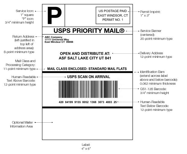 DMM TOC > 700 Special Standards705 Advanced Preparation and Special Postage Payment Systems3.0 Optional Procedure Mailing System 5.0 First-Class Mail or Standard Mail Mailings With Different Payment Methods 6.0 Combining Mailings of Standard Mail, Package Services, and Parcel Select Parcels 7.0 Combining Package Services and Parcel Select Parcels for Destination Entry 9.0 Combining Bundles of Automation and Nonautomation Flats in Trays and Sacks 10.0 Merging Bundles of Flats in Sacks and Pallets Using the City State Product 11.0 Combining Automation Price and Nonautomation Price Flats in Bundles 12.0 Merging Bundles of Flats on Pallets Using a 5% Threshold 13.0 Merging Bundles of Flats on Pallets Using the City State Product and a 5% Threshold 14.0 Combining Bundles of Flats Within FSS Zones 16.0 Plant-Verified Drop Shipment 17.0 Express Mail Open and Distribute and Priority Mail Open and Distribute 18.0 Express Mail Reshipment Service 19.0 Metered Mail Drop Shipment 20.0 Postage Due Weight Averaging Program 21.0 Optional Combined Parcel Mailings 1.0 Customized MarketMail1.1 Basic Standards1.1.1 GeneralCustomized MarketMail (CMM) is an option for mailing nonrectangular or irregular-shaped Regular Standard Mail and Nonprofit Standard Mail pieces weighing 3.3 ounces or less that meet the physical characteristics and dimensional requirements in 1.1.3 and the mail preparation standards in 1.4. Other Regular and Nonprofit Standard Mail pieces measuring 3/4 inch thick or less and meeting the standards in 1.0 may be entered as CMM at the mailer's option. CMM must be entered at a destination delivery unit (DDU). 1.1.2 Eligibility StandardsAll pieces in a CMM mailing must: a. Meet the basic content and eligibility standards for Standard Mail in 243.2.0 through 243.4.0 and, for Nonprofit Standard Mail, the additional standards in 703.1.0. b. Be part of a mailing of at least 200 addressed pieces. All pieces must be identical in size, shape, and weight unless excepted under an approved postage payment system. c. Bear a complete delivery address using the addressing formats in 602.1.0 or the exceptional or occupant address formats in 602.3.0 with the correct ZIP Code or ZIP+4 code. These additional addressing standards apply: 1. Detached address labels under 602.4.0 are not permitted. 2. Ancillary service endorsements under 507.1.0 are not permitted. 3. The ZIP Code accuracy standard in 243.3.8 must be met. d. Be marked, sorted, and documented as specified in 1.4. e. Be entered at the destination delivery unit appropriate to the delivery address on the mail, under 246.5.0, Destination Delivery Unit (DDU) Entry, or as a mailing using Express Mail or Priority Mail Open and Distribute under 17.5 and 17.5.13, or as a plant-verified drop shipment (PVDS) mailing under 16.0. There are no minimum volumes per destination. 1.1.3 Physical StandardsMailpieces prepared as Customized MarketMail (CMM) under 1.0 must meet these additional standards: a. The material used for the pieces must be free of sharp edges, protrusions, and other elements that could cause harm or injury to USPS personnel handling these pieces. b. The pieces must not be smaller than the minimum size for letter-size mail in 201 or greater than the maximum size for flat-size mail in 301. Length and height are defined as follows: 1. The length is determined by drawing a straight line between the two outer points most distant from each other. 2. The height is determined by drawing perpendicular lines to the points that are the greatest distance above and below the axis of length. The sum of these two lines is the height. c. The maximum weight is 3.3 ounces. d. Pieces may be any shape and may include die cuts, holes, and voids. e. Pieces must be flexible enough to fit inside a minimum-size mail receptacle measuring 4-7/8 inches wide, 14-7/8 inches high, and 5-7/8 inches long (deep). f. Design approval by the district business mail entry manager is recommended, but not required. 1.2 Prices1.3 Extra ServicesCMM is not eligible for any extra service. 1.4 Preparation Standards1.4.1 All MailingsAll CMM pieces are subject to the preparation standards in 1.4 and to these general standards: a. CMM pieces must not be part of a mailing containing any other type of Standard Mail pieces. b. Each mailing must meet the applicable standards for mail preparation in 245.1.0 and 245.2.0 and the following: 1. Regular Standard Mail pieces must be marked “Presorted Standard” and Nonprofit Standard Mail pieces must be marked "Nonprofit Organization" or with applicable abbreviations under 202. All pieces also must be marked "Customized MarketMail," "CUST MKTMAIL," or "CMM." 2. At the mailer's option, a carrier route information line under 708.6.0 may be added. If used, a carrier route code must be applied to every piece in the mailing using CASS-certified software and the current USPS Carrier Route File scheme, printed Carrier Route Files, or another AIS product containing carrier route information, subject to 509.1.0 and 708.3.0. Carrier route information must be updated within 90 days before the mailing date. 1.4.2 Required EndorsementCustomized MarketMail pieces must bear the endorsement "Carrier—Leave If No Response" placed directly below the return address under 508.1.0. If any other endorsement is used, the carrier route release endorsement must be separated by the equivalent of one blank line of the type size used. 1.4.3 PostageCMM is subject to postage payment (precanceled stamps, metered postage, or permit imprint) for Standard Mail pieces under 244. 1.4.4 DocumentationA complete, signed postage statement, using the correct USPS form or an approved facsimile, must accompany each mailing. Mailings of nonidentical-weight pieces or mailings using more than three different types of containers must also be supported by standardized documentation meeting the standards in 708.1.0. Documentation for nonidentical-weight pieces is not required if the correct postage 