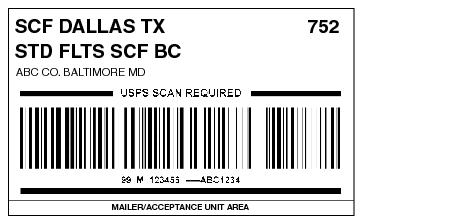 Intelligent Mail Tray Label 6.5.4 Intelligent Mail Tray Label FormatThe core data elements for the Intelligent Mail tray label are as follows: b. Tray or Sack Destination (Postal destination name). c. Content Identifier Number (CIN) description (tray or sack content). d. Office of mailing or mailer information. e. Destination ZIP Code (the ZIP Code of the trays' or sacks' final destination). g. Mailer ID (unique identifier of the mailer). h. 24-digit, ISS Code 128 subset C barcode numeric line. i. Mailer's Area (set aside for mailer-generated human-readable information). 6.5.5 Barcode CompositionThe barcode composition is dependent on the Mailer ID assigned by the USPS. Upon request by the mailer, the USPS assigns a 6-digit or 9-digit Mailer ID based on the demonstrated mail volume of the mailer. Intelligent Mail tray barcodes contain the following elements: b. Content Identifier Number (CIN), as listed in Exhibit 6.2.4. c. Processing code, identifying the system or facility generating the label. d. Mailer ID. e. Serial number, a unique number assigned to each tray or sack. f. Label type, a default digit. 6.5.6 Unique Serial NumberThe Intelligent Mail tray barcode can encode a unique identifier for each tray and sack. 6.5.7 Quality Assurance ProvisionsMailers printing Intelligent Mail tray labels are responsible for the inspection and testing of the labels prior to submission to USPS and for maintaining the overall quality of the labels produced. Inspection and testing of Intelligent Mail tray labels should be performed periodically. Mailers and label vendors are encouraged to submit samples to the National Customer Service Center (NCSC) in Memphis for certification (see 608.8.0 for address). 6.6 Intelligent Mail Container Placards (Labels)6.6.1 DefinitionMailer-generated container placards bearing Intelligent Mail container barcodes identify pallets and other rolling stock, such as all-purpose containers. Intelligent Mail container barcodes uniquely identify each container and may be scanned at induction points. Detailed specifications for Intelligent Mail container barcodes and placards are available at http://ribbs.usps.gov. 6.6.2 Intelligent Mail Container Placard ConfigurationsIntelligent Mail container placards must be affixed on the outside of any shrinkwrap or plastic by self-adhesive or other adhesive means. Placards may be produced in two configurations: a. Affixed placard measuring at least 8 inches by 11 inches. See 6.6.3 for placard specifications and 6.6.5 placard placement. b. Optional affixed placard measuring at least 4 inches by 7 inches. See 6.6.6 for placard specifications and 6.6.5 for placard placement. 6.6.3 Intelligent Mail Container Placard FormatIn addition to the general requirements for pallet placards in 705.8.6, Intelligent Mail container placards (see Exhibit 6.6.3) must retain the top one-half of the placard for USPS-required elements. The USPS banner, identification bars, and human-readable text are required elements related to the Intelligent Mail container barcode and will serve as a guide to distinguish the barcode from the other information on the container placard. Required elements include: a. USPS Banner. “USPS SCAN REQUIRED” must be printed in all uppercase letters centered above the barcode and embedded within the upper identification bar. Clear zone and font size are as follows: 1. A clear zone of at least 0.125 inch, but no more than 0.5 inch, must be maintained between the bottom edge of the text and the top of the barcode. 2. The banner must be printed in a boldface sans-serif font of at least 14-point type. b. Identification Bars. Horizontal black bars of at least 0.10 inch thick must be printed above and below the barcode. At a minimum, the bars must extend the length of the barcode. Clear zone and other requirements are as follows: 1. The upper bar must be printed at least 0.125 inch above the top edge of the barcode. 2. The upper bar must have a void in the middle sufficient to insert the USPS banner without any element being obscured. 3. The lower bar must be printed at least 0.125 inch below the human-readable representation of the barcode string. c. Human-Readable Representation of Barcode Data. The human-readable representation of barcode data (text) must be printed in a boldface sans-serif font of at least 12-point type. The text must not exceed the length of the barcode and must be separated by data field. Two blank character spaces must be left between each field. The text must be centered at least 0.125 inch, but no more than 0.25 inch, below the barcode. d. Barcode Location. The barcode, along with the corresponding USPS banner and identification bars, must be printed on the front side of the pallet placard. When the identification bars extend beyond the length of the barcode, the barcode must be horizontally centered. e. Minimum size. The minimum size of this placard is 8 inches high by 11 inches long. See additional specifications at http://ribbs.usps.gov. Mailers using larger placards must ensure the barcode conforms to the published specification and the human-readable content is provided as illustrated in Exhibit 6.6.3 and as published on the RIBBS web site.