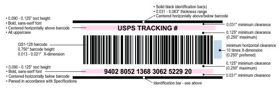 6.2.5 Line 3 (Origin Line)The origin line must appear below the content line, except as allowed under 6.3.4 and 6.2.5a and 6.2.5b. The origin line must show the city and state of the entry Post Office or the mailer's name and the city and state of the mailer's location (city and state information may be abbreviated if such abbreviations are in the USPS City State Product). A mailer code assigned by the USPS or such words as “Mailer” or “From” may appear before the required information on this line. Mailers who choose to print destination entry office information on line 3 instead of the origin information must print the origin information as follows: a. When the origin information is not printed on line 3, it must be printed right-justified in the “MAILER AREA” shown in exhibit 6.3.2. b. When the origin information is printed in the “MAILER AREA” instead of line 3, it must be directly preceded by “ORIGIN:” or “ORGN:” and it may contain, at a minimum, the mailer's name and ZIP Code of origin entry. 6.3 Specific Standards for Intelligent Mail Tray Labels6.3.1 DefinitionIntelligent Mail tray labels are 2-inch labels used on trays and sacks to provide unique identification within postal processing. 24-digit Intelligent Mail tray labels include only a 24-digit barcode printed in International Symbology Specification (ISS) Code 128 subset C symbology (see Exhibit 6.3.3). Intelligent Mail tray labels also include a human readable field designed to indicate the carrier route for carrier route mailings, display an “AUTO” indicator text for automation mailings, or remain blank for nonautomation mailings. Mailers using Intelligent Mail tray labels must print labels in the 24-digit Intelligent Mail tray label format. Detailed specifications for the tray label and barcode formats are at http://ribbs.usps.gov. 6.3.2 24-Digit Intelligent Mail Tray LabelIntelligent Mail tray labels, printed in the 24-digit format, can be used on all trays and sacks to uniquely identify each tray and sack in addition to each mailer or mail preparer. 24-digit Intelligent Mail tray labels bear a single barcode and permit an expanded mailer's use area (see Exhibit 6.3.2). Exhibit 6.3.2 Intelligent Mail Tray Label 6.3.3 Intelligent Mail Tray Label FormatThe core data elements for the Intelligent Mail tray label are as follows: b. Tray or Sack Destination (Postal destination name). c. Content Identifier Number (CIN) description (tray or sack content). d. Office of mailing or mailer information. e. Destination ZIP Code (the ZIP Code of the trays' or sacks' final destination). g. Mailer ID (unique identifier of the mailer). h. 24-digit, ISS Code 128 subset C barcode numeric line. i. Mailer area (set aside for mailer-generated human-readable information or for origin information on 24-digit Intelligent Mail tray labels when the mailer chooses to print destination entry office information on line 3 of the tray label). 6.3.4 Barcode CompositionThe barcode composition is dependent on the Mailer ID assigned by the USPS. Upon request by the mailer, the USPS assigns a 6-digit or 9-digit Mailer ID based on the demonstrated mail volume of the mailer. Intelligent Mail tray barcodes contain the following elements: b. Content Identifier Number (CIN), as listed in Exhibit 6.2.4. c. Processing code, identifying the system or facility generating the label. d. Mailer ID. e. Serial number, a unique number assigned to each tray or sack. f. Label type, a default digit. 6.3.5 Unique Serial NumberThe Intelligent Mail tray barcode can encode a unique identifier for each tray and sack. 6.3.6 Quality Assurance ProvisionsMailers printing Intelligent Mail tray labels are responsible for the inspection and testing of the labels prior to submission to USPS and for maintaining the overall quality of the labels produced. Inspection and testing of Intelligent Mail tray labels should be performed periodically. Mailers and label vendors are encouraged to submit samples to the National Customer Service Center (NCSC) in Memphis for certification (see 608.8.0 for address). 6.4 Intelligent Mail Container Placards (Labels)6.4.1 DefinitionMailer-generated container placards bearing Intelligent Mail container barcodes identify pallets and other rolling stock, such as all-purpose containers. Intelligent Mail container barcodes uniquely identify each container and may be scanned at induction points. Detailed specifications for Intelligent Mail container barcodes and placards are available at http://ribbs.usps.gov. 6.4.2 Intelligent Mail Container Placard ConfigurationsIntelligent Mail container placards must be affixed on the outside of any shrinkwrap or plastic by self-adhesive or other adhesive means. Placards may be produced in two configurations: a. Affixed placard measuring at least 8 inches by 11 inches. See 6.4.3 for placard specifications and 6.4.5 placard placement. b. Optional affixed placard measuring at least 4 inches by 7 inches. See 6.4.6 for placard specifications and 6.4.5 for placard placement. 6.4.3 Intelligent Mail Container Placard FormatIn addition to the requirements for pallet placards in 705.8.6, Intelligent Mail container placards (see Exhibit 6.4.3) must retain the top one-half of the placard for USPS-required elements, except as allowed under 705.8.6.6. The USPS banner, identification bars, and human-readable text are required elements related to the Intelligent Mail container barcode and will serve as a guide to distinguish the barcode from the other information on the container placard. Required elements include: a. USPS Banner. “USPS SCAN REQUIRED” must be printed in all uppercase letters centered above the barcode and embedded within the upper identification bar. Clear zone and font size are as follows: 1. A clear zone of at least 0.125 inch, but no more than 0.5 inch, must be maintained between the bottom edge of the text and the top of the barcode. 2. The banner must be printed in a boldface sans-serif fo
