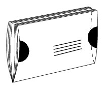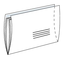 Spine on bottom; longer front cover folded over inside pages to create a nonperforated inner flap sealed within top edge.