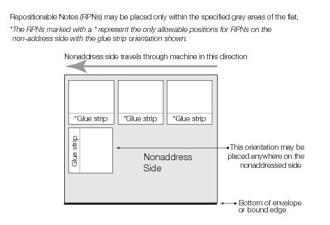 c. For flat-size mailpieces, a single RPN may be attached to either the address side or nonaddress side of the mailpiece and attached in the locations described and shown in Exhibit 22.3g1 and Exhibit 22.3g2. d. RPNs are included as an integral part of the mailpiece for weight and postage price computation purposes. e. The written and graphic characteristics of the notes are considered when determining eligibility of mailpieces mailed at the Standard Mail and Nonprofit Standard Mail prices. f. Attach the RPNs to all pieces in the mailing. 22.2 Mailpiece Characteristicsa. Not be in a plastic wrapper (e.g., polybag, polywrap, or shrinkwrap). b. Be letter-size (including cards) or flat-size. 22.3 RPN Characteristicsa. Measure 3 inches by 3 inches, plus or minus 1/8 inch for either dimension. b. Not contain phosphorescent or red fluorescent colorants. c. Be adhered with a minimum of 3/4 inch (with a tolerance of 1/16 inch) adhesive strip across the top portion on the reverse side of the note. d. Not be placed in a manner that interferes with the delivery address, price markings, or postage and must not display a specific address or ZIP Code. References to general landmarks are permissible. 1. Position the RPN parallel with the length of the mailpiece. 2. Affix RPNs with labeling equipment to ensure adequate adhesion; do not affix RPNs manually. 3. Place the RPN to the left of the delivery address, no closer than 3/8 inch from the left edge of the delivery address. 4. Place the RPN at least 1/2 inch (with a tolerance of 1/8 inch) from the bottom and left edges of the mailpiece. 1. If the RPN is placed on the address side of the mailpiece, position the RPN according to Exhibit 22.3g1.