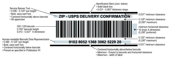 5.2.4 Use With Confirmation Services and Insurance (Integrated Barcode)To eliminate the need to place one barcode for Delivery Confirmation or Signature Confirmation and another barcode for insurance, eligible machinable parcels may qualify for the barcode discount by placing a single integrated barcode that combines Delivery Confirmation or Signature Confirmation and insurance using one of the following options: a. Single Concatenated Integrated Barcode. Mailers may place a single concatenated integrated barcode that combines postal routing information and postal insurance (see 503.9.0) with Delivery Confirmation service or Signature Confirmation service. The single concatenated integrated barcode option allows electronic option mailers to combine multiple special services into a single barcode on their packages. Single concatenated integrated barcodes must be prepared in accordance with the technical specifications and requirements in 503.9.0 for Delivery Confirmation service, 503.10.0 for Signature Confirmation service, and Publication 91. If a parcel bears a single concatenated integrated barcode then no other barcode that contains the postal routing barcode may be affixed to the package. b. Separate Barcodes. Mailers may place both a postal routing barcode described in 5.2.2 and an integrated barcode that combines insurance as described in 5.2a. on the same parcel with Delivery Confirmation in 503.9.0 or Signature Confirmation in 503.10.0. The integrated barcode option allows electronic mailers to combine multiple special services into a single barcode on their packages. 5.2.5 DimensionsThe preferred range of widths of narrow bars and spaces is 0.015 inch to 0.017 inch. The width of the narrow bars or spaces must be at least 0.013 inch but no more than 0.021 inch. All bars must be at least 0.75 inch high. 5.2.6 LocationSee 402.4.1 for barcode location standards. 5.2.7 Clear ZoneThe barcode must be located as specified in 402.4.1. No printing may appear in an area 1/8 inch above and below the barcode. A minimum clear (quiet) zone equal to 10 times the average measured narrow element (bars or space) width must be maintained to the left and right of the barcode. 5.2.8 ReflectanceBarcodes must be printed on substrate (e.g. shipping label) of uniform color and must meet requirements for reflectance as measured on a USPS-specified reflectance meter or barcode verifier. 5.2.9 QualityAll barcodes in each mailing must measure American National Standards Institute (ANSI) grade C or above. Information concerning ANSI guidelines X3.182-1990 may be obtained from the ANSI (see 608.8.3). 5.2.10 Human-Readable InformationThe human-readable information on the barcode must conform to one of the following options: a. For postal routing barcodes printed under 5.2.2, 5.2.3b, and 5.2.4b, if the postal routing barcode is printed on a separate label, the human-readable equivalent of the ZIP Code or ZIP+4 code encoded in the barcode preceded by the word “ZIP” must be printed between 1/8 inch and 1/2 inch below the barcode in 10-point or larger bold sans-serif type. Alternatively, the word “ZIP” may be placed no less than 10 times the average narrow bar or space element width and no more than 1/2 inch to the left of the barcode, in 10-point or larger bold sans-serif type (see Exhibit 5.2.2). While not recommended, if the postal routing barcode is printed on the delivery address label and is in close proximity to the address, the human-readable equivalent of the ZIP Code (and the word “ZIP”) may be omitted. b. For barcodes printed under 5.2.3b or 5.2.4b the human-readable information for the concatenated or concatenated/integrated barcode must include as text the application identifiers (AI) 420 and 91 and the full tracking identification number. When the AI 420 and ZIP Code information is used, it must be parsed separately from the main body of text. The first group will contain the 420 AI, space, 5-digit ZIP Code, space, +4 code (if used), space, with the remaining human-readable text parsed in groups of four with the remaining digits grouped at the end (e.g., 420 22021 9122 1234 5678 9123 4567 83). 5.2.11 Technical SpecificationsPostal routing codes must meet the technical specifications in the GS1-128 Application Identifier Standard, which can be obtained from Uniform Code Council Inc. (see 608.8.0), and the barcode characteristics in 5.0. 5.2.12 Substrate MaterialBarcodes must be printed on substrate material that preserves the optical specification as described in the AIM-USA Uniform Symbology Specification documents. Typically, white label stock commonly used for barcode generation is suitable, providing it is not glossy (causing mirror-like, specular reflection) or prone to smearing or smudging. 6.0 Standards for Barcoded Tray Labels, Sack Labels, and Container Placards6.1 General6.1.1 Tray and Sack LabelsIntelligent Mail tray labels (see 6.5), barcoded 2-inch tray and sack labels, and barcoded 1-inch sack labels are the USPS-approved methods to encode routing, content, origin, and mailer information on trays and sacks. Intelligent Mail tray labels are designed for use with Intelligent Mail barcoded mail and have the capacity to provide unique identification throughout postal processing. 6.1.2 Container PlacardsMailer-generated container placards bearing Intelligent Mail container barcodes identify the mail owner or agent and uniquely identify the unit (pallet, container, or rolling stock). Intelligent Mail container placards are designed for use with Intelligent Mail barcoded mail and Intelligent Mail tray labels. 6.2 Specifications for Barcoded Tray and Sack Labels6.2.1 UseExhibit 6.2.1 shows the types of mail requiring barcoded tray or sack labels. Barcoded labels must meet these general standards: a. Mailers must use the appropriate size label for the sack or tray. b. Mailer-produced barcoded labels must meet the standards in 6.0. c. All information on barcoded labels must be machine-p