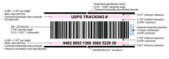 6.2.5 Line 3 (Origin Line)The origin line must appear below the content line in a location appropriate for a tray or sack as shown in Exhibit 6.2.2a or Exhibit 6.2.2b , except as allowed on 24-digit Intelligent Mail tray labels under 6.5.4 and 6.2.5a and 6.2.5b. The origin line must show the city and state of the entry Post Office or the mailer's name and the city and state of the mailer's location (city and state information may be abbreviated if such abbreviations are in the USPS City State Product). A mailer code assigned by the USPS or such words as “Mailer” or “From” may appear before the required information on this line. Mailers who choose to print destination entry office information on line 3 instead of the origin information must print the origin information as follows: a. When the origin information is not printed on line 3, it must be printed right-justified in the “MAILER AREA” shown in exhibit 6.5.3. b. When the origin information is printed in the “MAILER AREA” instead of line 3, it must be directly preceded by “ORIGIN:” or “ORGN:” and it may contain, at a minimum, the mailer's name and ZIP Code of origin entry. 6.3 Additional Standards—Barcoded 2-Inch Sack Labels and Barcoded Tray Labels6.3.1 Paper Stock, Size, and ColorBarcoded 2-inch sack labels and barcoded tray labels must meet these specifications: a. Color: white or manila for First-Class Mail and Standard Mail; pink for Periodicals. b. Reflectance: minimum reflectance requirements in 6.3.3i. c. Perforations: perforations are not permitted through the barcode and barcode quiet zone on labels. d. Weight: minimum 70-pound paper stock (500 sheets, 24 by 36 inches). e. Height: 1.860 inches minimum; 2.015 inches maximum. f. Length: 3.250 inches minimum; 3.515 inches maximum. g. Thickness: 0.005 inch minimum. 6.3.2 Printed Human-Readable LinesThe printed human-readable text lines must meet these specifications: a. General. The human-readable lines must be printed in uppercase letters, with no run-on letters or numerals. The letters and numerals in the destination, content, and origin lines must be easy to read. The character spacing can be proportional with respect to the type font used. b. Destination Line (Line 1). The printed destination line must have a minimum character height of 0.120 inch and a maximum character density of 17 characters per inch. The corresponding ZIP Code must have a minimum character height of 0.190 inch and a maximum character density of 10 characters per inch. The destination line must accommodate at least 21 characters for the destination city and state and any required prefixes, and 5 characters for the ZIP Code. Only the correct 3-digit ZIP Code prefix is to be printed when the required labeling for a tray includes only a 3-digit ZIP Code prefix for Line 1 (trailing zeros are not permitted). c. Content Line (Line 2). The printed content line must have a minimum character height of 0.120 inch. The content line must accommodate at least 21 characters and have an effective font density of no greater than 17 characters per inch. d. Origin Line (Line 3). The printed origin line must have a maximum character height of 0.085 inch and must accommodate at least 21 characters. e. Barcode Numeric Line. The barcode numeric line must consist of a numeric representation of the information contained in the barcode as required by 6.3.3b (5-digit ZIP Code, CIN, processing code). The printed numeric barcode line must have a maximum character height of 0.085 inch, must accommodate 10 characters, and must be placed below the barcode and lower barcode quiet zone as shown in Exhibit 6.2.2a Barcoded 2-Inch Sack Labels and Barcoded Tray Labels. f. Extraneous Information Lines. Extraneous information may be printed only at the top of the label and/or at the bottom of the label. The preferred location is the bottom of the label. If placed at the bottom of the label, the information must appear only in a rectangular area that begins 1.620 inches from the top of the label and extends to the bottom of the label. Within this lower area, the information may extend 2.75 inches to the right from the left edge of the label. See Exhibit 6.3.2f. Extraneous information at the bottom of the label must appear below the barcode numeric and origin lines. There are no font restrictions for information printed in this area at the bottom of the label with one exception: if information in this area resembles a day of the week or a USPS air stop code it must be in 10-point or smaller type. Extraneous information printed at the top of the label must have a maximum character height of 0.083 inch. Barcodes for a mailer’s internal use may not be placed in extraneous information areas or anywhere else on the label, unless approved on a case-by-case test basis by USPS Engineering (see 608.8.0 for address). Exhibit 6.3.2f Extraneous Information Area6.3.3 BarcodeThe label barcode must meet these specifications: a. Type of Barcode. The barcode must be an interleaved 2-of-5 code according to the Automatic Identification Manufacturers’ Uniform Symbology Specification (AIM/USS-I 2/5) with the exceptions noted below. b. Information. The barcode must represent three numeric elements: 1. The 5-digit ZIP Code destination of the tray. For a 3-digit tray destination, the 3-digit ZIP Code prefix is followed by two zeros. 2. The applicable 3-digit content identifier number (CIN) for the tray as shown in 6.2.4. 3. A 2-digit USPS processing code on all 2-inch tray labels. A processing code is optional on 2-inch sack labels. Use code “01” for all automation price and machinable letter-size pieces, and for all automation-compatible and cotrayed flat-size pieces. Use code “07” for all other mail, including manual pieces, nonmachinable letter-size pieces, and nonautomation Carrier Route price pieces. c. Placement. The barcode must be on the left side of the tray label, below the destination and content lines. The top of the 