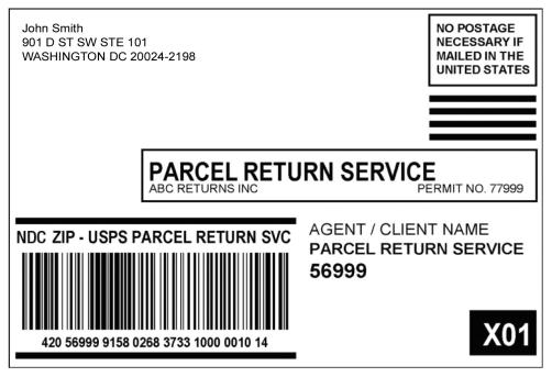 An authorized BPRS permit holder has the option to use a label to identify BPRS parcels for return to a designated postal facility. The label is prepared at the mailer’s expense and must meet all format requirements described in 7.5 and 7.6 and specifications in 402.4.0, for a postal routing barcode symbology used to produce a correct, readable barcode for the return address. Each label must be accompanied by complete instructions for its use.