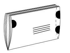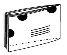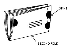 Spine on bottom; longer front cover folded over inside pages to create a nonperforated inner flap sealed within top edge.