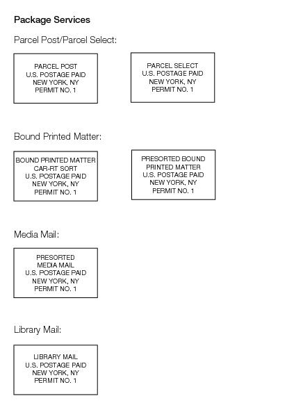 h. The address side must appear as described in this section and shown in the illustration below. Nothing may be added except a return address, FIM, or barcode. 4.5 Mailings4.5.1 Mailing Date FormatThe mailing date in meter indicia must meet the format standards in this section. The year must be represented by all four digits or by the last two digits. Mailers may print the indicia directly onto mailpieces or onto separate labels or tape affixed to mailpieces. The mailing date format used in the indicia is also subject to the following conditions. a. Complete Date. Mailers must use a complete date for the following: 1. All First-Class Mail, Priority Mail, and Express Mail pieces. 2. All mailpieces with Insured Mail, COD, or Special Handling service. 3. All mailpieces prepared with the indicia printed on nonadhesive paper (e.g., computer printer paper) and affixed to the mailpiece or used as part of an insert in a window envelope. b. Month and Year. Mailers may use a complete date or a mailing date consisting solely of the month and year in the indicia only for Standard Mail and Package Services pieces. c. No Date. Mailers must use indicia with no mailing date for prepaid metered reply postage. As an option, mailers may use indicia with no mailing date for Standard Mail and Package Services pieces not subject to 4.5.2a. 4.5.2 Mailing Date Accuracy and Mailing PeriodsThe date or period when mailers may deposit or present metered mail for mailing is controlled by the mailing date in the indicia under the following conditions. a. Complete Date. Mailpieces bearing a complete date in the indicia must be deposited or presented on that date, except that pieces entered after the day's last scheduled collection from the Post Office or collection box may bear the actual date of entry or the date of the next scheduled collection from the Post Office or collection box. When authorized by USPS, presort mail accepted after midnight may bear the previous day's date. If the mailer knows that the mail is not to be deposited or presented on the date in the indicia, the mailer must use a date correction indicium under 4.4.1. b. Month and Year. Mailpieces bearing only the month and year in the indicia may be deposited or presented for mailing on any day during the month shown in the indicia and through the third day of the following month. c. No Date. Mailpieces bearing no date in the indicia may be deposited or presented for mailing on any date. 4.5.3 Deposit of MailMailers must deposit or enter mailpieces with metered or PC Postage indicia according to the following conditions. a. Mailers may deposit Express Mail, Flat Rate Priority Mail, Priority Mail weighing one pound or less, single-piece price First-Class Mail, single-piece price Media Mail, and single-piece price Library Mail items with a metered or PC Postage indicia at any postal facility, preferably within the area of the customer's local Post Office. Mailers may also deposit zone-priced Priority Mail pieces at any postal facility, provided the postage affixed to each mailpiece is calculated to include the amount due as specified in 4.3.1, taking into account the weight, shape, and the zone from the ZIP Code of the office where the mailpiece is deposited to the ZIP Code of the destination address. b. Mailers must deposit all mail not specified in 4.5.3a as follows: 1. At a postal facility within the ZIP Code shown in the indicia. 2. For Presort price mail, at the authorized mailing office if not at a facility within the ZIP Code shown in the indicia. c. Mailers also may dropship metered mail according to standards in 705.19.0. 4.6 Authorization to Produce and Distribute Postage Evidencing SystemsTitle 39, Code of Federal Regulations, part 501, contains information concerning authorization to produce and distribute postage evidencing systems. Additional information may be obtained from the manager, Postage Technology Management (see 608.8.1 for address). 5.0 Permit Imprint (Indicia)5.1 General Standards5.1.1 DefinitionA mailer may be authorized to mail material without affixing postage when payment is made at the time of mailing from a permit imprint advance deposit account established with USPS for that purpose. This payment method may be used for postage and extra service fees for Express Mail (electronic verification system "eVS" only), Priority Mail (including Critical Mail), First-Class Mail, Standard Mail, Package Services, and Parcel Select. This method is not available for Periodicals and must not be used to pay postage on any mailpiece that is designed for reply purposes (except for permit reply mail under 507.10.0). 5.1.2 Minimum VolumePermit imprint mailings must contain at least 200 pieces or 50 pounds of mail, except: a. Other higher minimum quantities may apply, depending on the price claimed. b. An occasional First-Class Mail mailing may contain fewer than 200 pieces if from a mailer whose total daily mailings are not much more than 200 pieces but who, to cooperate with the Post Office, presents a part of that mail early in the day. c. A mailing may contain fewer than 200 pieces if it is the completion of a large mailing extending over 2 or more consecutive days and the mailer includes an explanation on the accompanying postage statement. d. Single-piece price mailings submitted under the terms of an approved manifest mailing system agreement with a minimum volume reduction provision. e. Bound Printed Matter nonpresorted, non-discounted mailings. 5.1.3 Use of Permit ImprintEach mailpiece sent under this payment method must bear a permit imprint indicia showing that postage is paid. Permit imprint indicia may be printed directly on mailpieces, on labels (including address labels) permanently affixed to mailpieces, or on mailpiece wrappers, envelopes, and other containers. Except where the enclosure is prohibited by other standards, matter bearing a permit imprint indicia may be mailed as an enclosure when postage for the enclosure or 