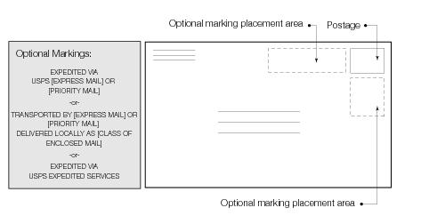 The enclosed mail may show one of the optional markings below. The optional marking must be placed directly below or to the left of the postage area. The optional marking may appear in any type font. When an optional marking is used, the type size of the required price marking (see 202 for letters, 302 for flats, or 402 for parcels) must be at least 8 points. 17.6 Enter and Deposit17.6.1 Verification and EntryMailers must prepare Express Mail Open and Distribute and Priority Mail Open and Distribute shipments under 17.2 and 17.5 and present shipments at a business mail entry unit (BMEU) or other location designated by the postmaster to accept both the enclosed mail and, when applicable, Express Mail. Open and Distribute containers must not be sealed until the BMEU verification and acceptance of the contents has been completed, unless accepted under an alternate procedure authorized by Business Mailer Support. 17.6.2 EntryA PS Form 3152, Confirmation Services Certification, (Priority Mail Open and Distribute) or PS Form 3152-E (Express Mail Open and Distribute) must accompany each Open and Distribute shipment. Mailers must present shipments to the BMEU with enough time for acceptance, processing, and dispatch before the facility's critical entry time for Express Mail or Priority Mail. 18.0 Express Mail Reshipment Service18.1 Basic Information18.1.1 GeneralThe USPS gathers mail addressed to Post Office boxes or business street addresses and dispatches it as a Custom Designed or Next Day Service shipment under a service agreement (PS Form 5637) between the USPS and the mailer, subject to these standards: a. Service frequency is scheduled. b. The mailer is charged a Pickup on Demand fee each time mail is collected for reshipment from a Post Office no matter how many Post Office boxes or business street addresses the mailer may have at that office. c. Express Mail postage and fees are paid by Express Mail Corporate Account or federal agency “Postage and Fees Paid” indicia. The sack or container and its contents are considered a single piece for calculation of the Express Mail price of postage and must not exceed 70 lbs. d. The mailer must keep a postage-due, merchandise return service, or business reply mail account at the postal facility where the Post Office box or business street address is located for any shortpaid, merchandise return service, or business reply mail. The service agreement (PS Form 5637) must state that such an account exists. e. Delivery Confirmation and accountable mailpieces (Certified Mail, COD, insured, Signature Confirmation, or Express Mail) are reshipped and charged separately from non-accountable mailpieces. Registered Mail is not allowed for Express Mail reshipment service. f. The service agreement must list the Business Development Team at the originating office as the “Firm Representative” and show the pickup time is when the USPS employee gathers the mail and prepares it for dispatch as Express Mail. g. Commencement and termination of service agreements are subject to the standards for Express Mail Custom Designed Service. 19.0 Metered Mail Drop Shipment19.1 Basic Information19.1.1 GeneralA customer may affix postage using a postage meter (postage evidencing system) licensed at one Post Office (licensing Post Office) and deposit that mail at another Post Office (entry Post Office) only if prior authorization is obtained from the USPS under one of the procedures described below. Such authorization may be revoked under 19.2.6 when the USPS determines that information or circumstances supporting the original authorization may no longer be accurate, complete, or applicable. (604.4.0 provides an exception to this standard for metered Express Mail, Priority Mail, and single-piece price metered mail.) These general conditions apply: a. The meter stamp or indicium must show the name of the licensing Post Office. b. Metered mailpieces that bear meter impressions or other endorsements containing the wrong Post Office name, authorization number (as applicable), or other required information are not accepted. c. A metered mail drop shipment must be deposited at the time and place and under any additional condition specified by the USPS. d. Annual mailing fees, as applicable for the class of mail, must be paid at the office(s) where mailings will be entered, as required under 233.3.4 or 243.3.4. 19.1.2 Effect on ServiceThe USPS assumes no responsibility for the material presented until it is accepted into the mail. The USPS is not responsible for service delays when the mailer does not meet the applicable preparation or entry requirements. Entry of mail by drop shipment may adversely affect the USPS’s ability to achieve the applicable service objectives. 19.1.3 ChangesA mailer authorized to drop ship metered mail must inform the approving official of all changes to the information originally provided as part of the application. When the USPS asks, the mailer must submit additional information supporting that authorization. Failure to provide this information is grounds to revoke the authorization. 19.2 Authorization19.2.1 Options 1 & 2Authorizations under Options 1 and 2 in 19.3, Option 1: Deposit at P&DC/F, and 19.4, Option 2: Deposit at Another Post Office, are granted to meter license holders. The meter license holder must apply in writing to the district manager of business mail entry whose district includes the licensing Post Office of the meter holder. 19.2.2 Options 3 & 4Authorization under Option 3 in 19.5, Option 3: Consolidated Drop Shipment With Endorsement, is granted to mailers intending to present mail for other meter license holders (including their own mail, if applicable) at one location other than the licensing office(s), whereas authorization under Option 4 in 19.6, Option 4: Consolidated Drop Shipment Without Endorsement, is granted for mailings presented at more than one location. For authorization under Option 3, the mailer or consolidator m