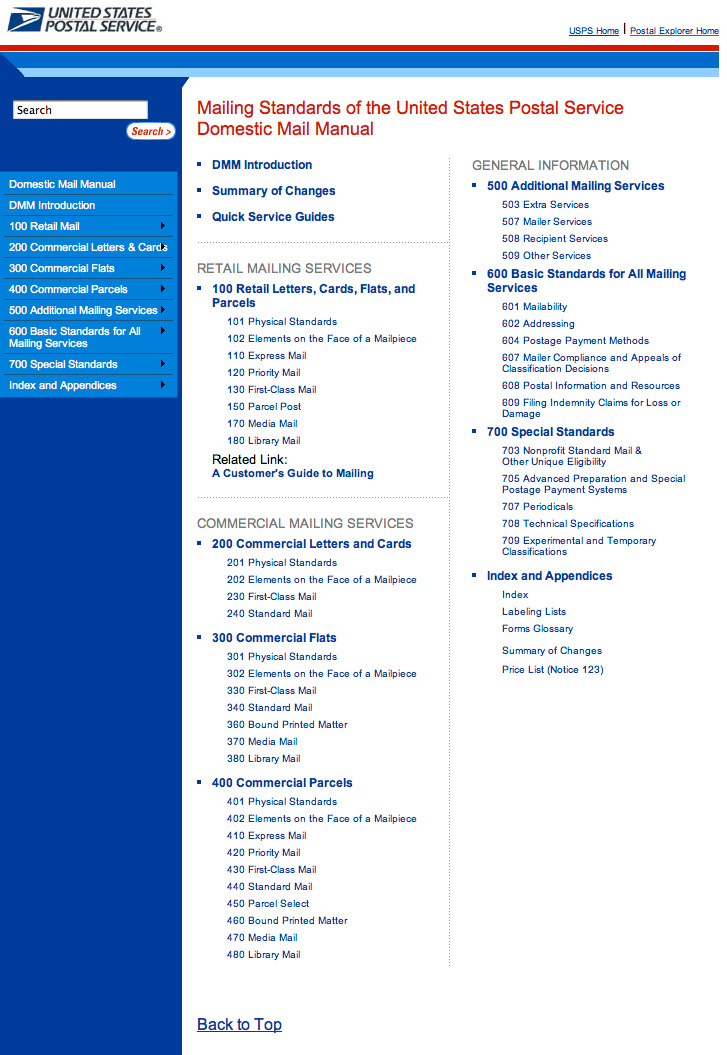 • Information grouped by mailing method, shape, class of mail, and topic.