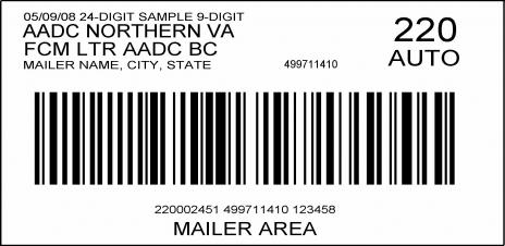 7.1.2 Intelligent Mail BarcodesWhen flat-size pieces bear an Intelligent Mail barcode (under 4.3) for automation-price eligibility purposes, the barcode on a piece that contains an optional endorsement line (OEL) must contain OEL coding that includes information in Exhibit 708.7.1.1 that corresponds to the correct sortation level of each bundle. The OEL information in the Intelligent Mail barcode is required in addition to a physical OEL. See the Intelligent Mail Barcode Resource Guide available at http://ribbs.usps.gov/ for more information on incorporating OELs in Intelligent Mail barcodes. 7.1.3 KeylineA mailer's keyline or comparable information may not be placed on the same line as the OEL or on the line above the OEL. A keyline used on valid ACS mailpieces is subject also to 7.2.4, No ACS Code in OEL. 7.1.4 Firm BundlesOn a firm bundle of carrier route presorted Periodicals, “FIRM” may precede “CAR-RT SORT” in the carrier route information line under 6.0. 7.1.5 Price MarkingsAt the mailer’s option, price markings required by the standards for the price claimed may be included in the OEL if the OEL appears on each piece in the mailing and if it remains a single line with the basic bundle label information (required by 7.1.1) at the right end (e.g., on a carrier route bundle of Enhanced Carrier Route Saturation Standard Mail: * * * * ECRWSS**C-001; on an automation Standard Mail 3-digit bundle: * * * * AUTO**3-DIGIT 750). 7.1.6 Exceptional Address FormatThe exceptional address format may appear above the OEL as specified in 602.3.0, Use of Alternative Addressing. 7.1.7 OEL With LOT InformationAt the mailer’s option, line-of-travel (LOT) information for carrier route Periodicals and Enhanced Carrier Route Standard Mail may be included in the OEL using the applicable format in 7.1.1. All other OEL requirements apply. If there is insufficient space within the OEL to include any other information required (e.g., ACS participant code), this OEL format may not be used. 7.1.8 Required OEL Use in Combined Mailings of Standard Mail and Periodicals FlatsMailers authorized to combine Standard Mail flats and Periodicals flats, under 705.15.0, must apply an OEL identifying the presort level of the bundle and other applicable information as specified in 7.1 to each mailpiece. The following additional standards also apply: a. Each OEL must contain the format elements described in 7.2 and must include a “MIX COMAIL” human-readable text, as its most right-justified element. b. Mailpieces may include LOT information, in accordance with 7.1.7, only when there is sufficient space for the human-readable text in item a and all other required information. c. When combined mailings of Standard Mail and Periodicals flats are prepared to FSS zones under 705.15.1.11, each mailpiece must bear a “SCH 5-Digit FSS MIX COMAIL” human-readable text, including the correct ZIP code listed in Column B of L006, as described in Exhibit 7.1.1. 7.2 OEL Format7.2.1 Presort IdentificationExcept when an address block barcode is placed above the optional endorsement line (OEL), the appropriate presort identification must be the first line at the top of the address block or label. A mailer receiving address corrections through Address Change Service (ACS) may use the first eight positions on the left side of the OEL for an ACS human-readable participant code. 7.2.2 Style and Size of TypeThe information in the OEL must meet the following conditions: a. Letters must be the same type font as those in the address block. b. The OEL must contain only capital letters of the alphabet, Arabic numerals, or asterisks. c. Font size and line spacing must be no less than the size and line spacing of the largest letters or characters in the address block or any part of the address label, except as provided under 7.2.2d. d. At the mailer's option, characters are a minimum of 8 point font size on mailpieces that do not bear a traditional ACS printed participant code (see 507.4.0). Under this option, characters may not overlap and must be evenly spaced. 7.2.3 ACS Code in OELIf an ACS human-readable participant code (see 507.4.2) is used in an OEL on a label or in an address block, the delimiter symbol (#) must be in the first position at the left margin of the OEL, followed by the seven-character USPS-assigned ACS participant code, then one blank space. The remaining blank spaces between the left-justified delimiter and ACS participant code and the first character of the right-justified mail sortation information of the OEL must be filled with asterisks. 7.2.4 No ACS Code in OELIf an ACS human-readable participant code is not placed in the OEL as permitted by 507.4.2.4, the OEL must be filled with asterisks from the left margin of the label or address block up to the first character in the OEL. A keyline prepared under 7.1.3 is required on valid ACS mailpieces if an ACS participant wants to receive notification of nondelivery information under 507.1.4.1 in addition to address correction service. 7.2.5 ZIP Code InformationExcept for carrier route bundles, the OEL must include the ZIP Code information (5-digit ZIP Code or 3-digit ZIP Code prefix) determined by the sortation level and, when applicable, by the labeling list designated in Exhibit 7.2.5 for ADC, mixed ADC, AADC, or mixed AADC sortation levels. Carrier route OELs must show carrier route information as specified in 8.2. Exhibit 7.2.5 OEL Labeling Lists