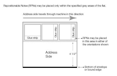 22.0 Repositionable Notes (RPNs)22.1 UseRPNs must meet all of the following standards: a. RPNs may be attached to letter- and flat-size commercial First-Class Mail, Standard Mail, and Periodicals mailpieces. b. For letter-size mailpieces, attach a single RPN to the address side of the mailpiece as specified in Exhibit 22.1b. Exhibit 22.1b Placing RPNs on Lettersc. For flat-size mailpieces, a single RPN may be attached to either the address side or nonaddress side of the mailpiece and attached in the locations described and shown in Exhibit 22.3g1 and Exhibit 22.3g2. d. RPNs are included as an integral part of the mailpiece for weight and postage price computation purposes. e. The written and graphic characteristics of the notes are considered when determining eligibility of mailpieces mailed at the Standard Mail and Nonprofit Standard Mail prices. f. Attach the RPNs to all pieces in the mailing. 22.2 Mailpiece Characteristicsa. Not be in a plastic wrapper (e.g., polybag, polywrap, or shrinkwrap). b. Be letter-size (including cards) or flat-size. 22.3 RPN Characteristicsa. Measure 3 inches by 3 inches, plus or minus 1/8 inch for either dimension. b. Not contain phosphorescent or red fluorescent colorants. c. Be adhered with a minimum of 3/4 inch (with a tolerance of 1/16 inch) adhesive strip across the top portion on the reverse side of the note. d. Not be placed in a manner that interferes with the delivery address, price markings, or postage and must not display a specific address or ZIP Code. References to general landmarks are permissible. 1. Position the RPN parallel with the length of the mailpiece. 2. Affix RPNs with labeling equipment to ensure adequate adhesion; do not affix RPNs manually. 3. Place the RPN to the left of the delivery address, no closer than 3/8 inch from the left edge of the delivery address. 4. Place the RPN at least 1/2 inch (with a tolerance of 1/8 inch) from the bottom and left edges of the mailpiece. 1. If the RPN is placed on the address side of the mailpiece, position the RPN according to Exhibit 22.3g1. Exhibit 22.3g1 Placing RPNs on Flats—Address Side2. If the RPN is placed on the nonaddressed side of the mailpiece, position the RPN according to Exhibit 22.3g2. Exhibit 22.3g2 Placing RPNs on Flats—Nonaddress Side22.4 RPNs on Automation-Price Mailpieces22.4.1 Letter-Size MailpiecesLetter-size mailpieces with RPNs claiming automation prices must meet the standards in 22.1 through 22.3, 201.3.0, and the following additional standards: a. Each mailpiece must be rectangular and have a surface smoothness of 195 Shefield Units or smoother. b. Enveloped mailpieces. Each mailpiece prepared in an envelope must be constructed from paperstock having a basis weight of 20 pounds or greater. Window envelopes must have a closed panel made of polystyrene or glassine. Each enveloped mailpiece is limited to the following dimensions: 1. For height, no less than 4-1/8 inches and no more than 6 inches high. 2. For length, no less than 8 inches and no more than 9-1/2 inches long. 3. For thickness, no less than 0.02 inch and no more than 0.125 inch thick. c. Oversize cards. Each mailpiece prepared as an oversize card is limited to the following dimensions: 1. For height, no less than 4-1/2 inches and no more than 6 inches high. 2. For length, no less than 8-1/2 inches and no more than 9 inches long. 3. For thickness, no less than 0.009 inch thick (cards 5-3/4 inches or more in height must be no less than 0.012 inch thick.) 22.4.2 Flat-Size MailpiecesFlat-size mailpieces with RPNs claiming automation prices must meet the standards in 1.0 through 3.0 and 301.3.0. 22.5 Prices22.6 ComplianceMailers must comply as follows: a. RPNs must be obtained from an approved RPN vendor (see www.usps.com for a listing of approved vendors). Prospective vendors can obtain USPS standards and test procedures from USPS Engineering (see 608.8.0 for address). Testing must be performed by a certified independent laboratory. b. Mailers must present evidence at the time of mailing to show that their RPNs have been supplied by an approved vendor. The vendor name on the reverse side of the note will be sufficient as evidence; in lieu of the vendor name printed on the notes, an invoice from the approved vendor for purchase of the RPNs will constitute such evidence. c. As part of each mailing, mailers must include two pieces addressed to the manager, USPS Engineering Letter Technology, Attn: RPN Sample (see 608.8.0 for address). 23.0 Full-Service Automation Option23.1 Description[1-26-14] Access to full-service automation option benefits requires the use of Intelligent Mail barcodes to uniquely identify each mailpiece. In addition to the standards described in 2.0, all pieces entered under the full-service option must individually meet the eligibility requirements for automation prices according to their class and shape. Full-service automation mailings require Intelligent Mail barcodes on mailpieces; Intelligent Mail tray labels on trays and sacks; and Intelligent Mail container placards on pallets or similar containers (when created). Additional requirements include the use of an approved electronic method to transmit postage statements and mailing documentation to the USPS (describing how mailpieces are linked to trays or sacks, and containers, if applicable) and scheduling dropship appointments through the Facility Access and Shipment Tracking (FAST) system for destination network distribution center, destination area distribution center, and destination sectional center facility dropshipments. 23.2 General Eligibility Standards[1-26-14] First-Class Mail, Periodicals, and Standard Mail letters and flats meeting eligibility requirements for automation or carrier route prices (except for Standard Mail ECR saturation flats), and Bound Printed Matter flats (except for Presorted DDU-entered and carrier route flats) are potentially eligible for full-service incentives. All pieces entered under full-service