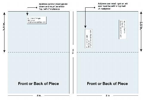 DMM TOC > 200 Commercial Letters and Cards202 Elements on the Face of a Mailpiece3.0 Placement and Content of Mail Markings 4.0 Placement and Physical Standards for Endorsements 5.0 Barcode Placement Letters and Flats 1.0 All Mailpieces1.1 Clear SpaceA clear space must be available on all mail for the address, postage (permit imprint, postage stamp, or meter stamp), postmarks, and postal endorsements. 1.2 Delivery and Return AddressThe delivery address specifies the location to which the USPS is to deliver a mailpiece. Except for mail prepared with detached address labels under 602.4.0, the piece must have the address of the intended recipient, visible and legible, only on the side of the piece bearing postage (Periodicals do not display postage and the address may appear on either side). Use at least 8-point type (each character must be at least 0.080 inch high). A sans-serif font is preferred. Addresses printed in all capital letters are also preferred. A return address is required in specific circumstances (see 4.2 and 602.1.5 for more information about return addresses). See 602 for additional information regarding addressing.) 1.3 Postage PaymentThe mailer is responsible for proper payment of postage. Standards for postage payment are specified for each shape and class of mail. 2.0 Address Placement2.1 Letters[6-2-14] The location of the delivery address on a letter-size mailpiece determines which dimensions are the length and height of the piece. The length is the dimension parallel to the address as read; the height is the dimension perpendicular to the length. Consequently, the placement of the address may render a piece nonmailable or nonmachinable (see 601.1.1.3). See 601.6.4 for addressing standards when a window envelope is used. On a letter-size piece, the recommended address placement is within the optical character reader (OCR) read area, which is a space on the address side of the mailpiece defined by these boundaries (see Exhibit 2.1): a. Left: 1/2 inch from the left edge of the piece. b. Right: 1/2 inch from the right edge of the piece. c. Top: 2-3/4 inches from the bottom edge of the piece. d. Bottom: 5/8 inch from the bottom edge of the piece. Exhibit 2.1 OCR Read Area 2.2 Flats2.2.1 Basic Standards[6-2-14] On all Periodicals, Standard Mail, Bound Printed Matter, Media Mail, and Library Mail flats mailed at presorted, automation, or carrier route prices, mailers must place the delivery address at least 1/8 inch from any edge of the mailpiece. For the purposes of these standards, the “delivery address” is the recipient’s name or other identification; the company information line; the street and number, and any necessary secondary information; and the city, state, and ZIP Code. The delivery address may appear on the front or the back of the mailpiece (but must be on the side bearing postage, except for Periodicals), parallel or perpendicular to the top edge, but it cannot be upside down as read in relation to the top edge. See 2.2.2 for additional standards for enveloped or polywrapped pieces, and card-style pieces; and 2.2.3 for bound or folded pieces not in envelopes or polywrap. See 601.6.4 for addressing standards when a window envelope is used. 2.2.2 Address Placement on Enveloped or Polywrapped Pieces[6-2-14] The following standards apply to enveloped, polywrapped, or card-style Periodicals (including shrinkwrapped Firm bundles), Standard Mail, Bound Printed Matter, Media Mail, and Library Mail flats mailed at presorted, automation, or carrier route prices: a. The “top” of the mailpiece is either of the shorter edges. b. The entire delivery address must be within the top half of the mailpiece (see Exhibit 2.2.2), except under 2.2.2c or 2.2.2d. Optimal placement is at the top edge (while maintaining the 1/8-inch clearance requirement). c. If a vertical address will not fit entirely within the top half, the address may cross the midpoint if it is placed within 1 inch of the top edge. d. If the delivery address is placed on an insert polywrapped with the host piece: 1. The address must not appear on a component that rotates within the bag. 2. The address must remain visible throughout the addressed component's range of motion. 3. The insert must be affixed to maintain the address entirely in the top half throughout processing and delivery or, if not affixed, the insert must maintain at least the beginning 0.5 inch of the address in the top half. The “beginning 0.5 inch” means the first half-inch of the recipient, delivery address, and city/state/ZIP Code lines, and not the end of each line. Exhibit 2.2.2 Delivery Address on Enveloped, Polywrapped, and Card-Style Pieces 2.2.3 Address Placement on Bound or Folded Pieces[6-2-14] The following standards apply to bound or folded Periodicals, Standard Mail, Bound Printed Matter, Media Mail, and Library Mail flats mailed at presorted, automation, or carrier route prices not in envelopes or polywrap (see 2.2.2 for all card-style pieces): a. The “top” is the upper edge of the mailpiece when the bound or final folded edge is vertical and on the right side of the piece. Exception: For Carrier Route (or Enhanced Carrier Route) saturation pieces, the “top” of the mailpiece is either of the shorter edges. b. The entire delivery address must be within the top half of the mailpiece (see Exhibit 2.2.3), except under 2.2.3c. Optimal placement is at the top edge (while maintaining the 1/8-inch clearance requirement). c. If a vertical address will not fit entirely within the top half, the address may cross the midpoint if it is placed within 1 inch of the top edge. Exhibit 2.2.3 Delivery Address on Bound or Folded Pieces 2.2.4 Type Size and Line Spacing[6-2-14] On all First-Class Mail, Periodicals, Standard Mail, Bound Printed Matter, Media Mail, and Library Mail flats mailed at presorted, automation, or carrier route prices, mailers must print the delivery address using at least 8-point type (each character must b