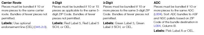 Bundle preparation must meet the applicable general standards in 345.5.0 (Presorted Standard Mail), 345.6.0 (Enhanced Carrier Route Standard Mail), or 345.7.0 (Automation Flat Mail). Mixed ADC bundles may not be placed on pallets. Bundle Size (705.8.9)