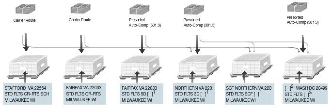 Two bands, one around the length and one around the width. Use sufficient tension. Wire and metal strapping are prohibited. Copalletized Bundles![]() Copalletization allows mailers to place together on pallets bundles from separate mailings that have been independently presorted in accordance with applicable standards (e.g., ECR, automation, and Presorted price mailings). Each separate mailing must separately meet the minimum volume and other requirements as set forth in 705.11.0 unless bundles are prepared under 705.11.0 (Preparation of Cobundled Price and Presorted Price Flats) mailers must bundle their mail separately according to the applicable requirements in 345.5.9 for Presort, 345.6.8 for Enhanced Carrier Route, or 345.7.0 for Automation. Copalletization requires Business Mailer Support authorization (705.8.7). Pallet Presort and Labeling (705.8.10)![]() At the mailer’s option, bundles of flats may be palletized using the advanced presort options in 705.10.0, 705.12.0, or 705.13.0. These presort options require PAVE-certified software. Copalletized mailings: Bundles of Presorted price and automation price flats must be placed on separate