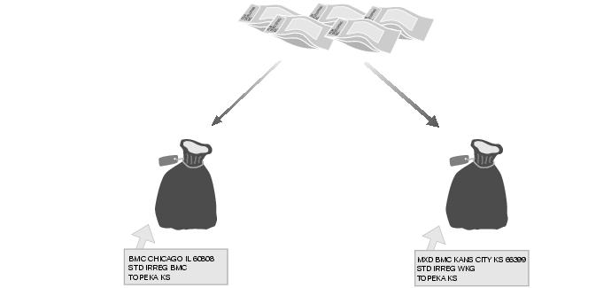 Labels: For Line 1, "MXD" followed by L601, Column B information for the BMC serving the 3-digit ZIP Code prefix of the entry Post Office. For Line 2, use "STD IRREG WKG."