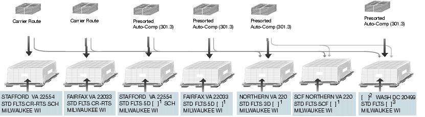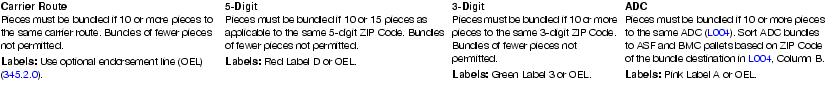Bundle Preparation: See previous page for physical bundle size and securing standards. Except for 5-digit and 5-digit scheme pallets, carrier route bundles may be combined with automation and Presorted rate bundles on the same pallet.
