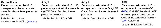 Bundle Preparation: See previous page for physical bundle size and securing standards. Except for 5-digit and 5-digit scheme pallets, carrier route bundles may be combined with automation and Presorted price bundles on the same pallet.