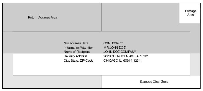 1. For MLOCR FASTforward users, the name of the recipient must appear in the OCR read area. Dark shaded area indicates "free space" for nonaddress printing. Light shaded area indicates preferred clear zone to enhance readability.