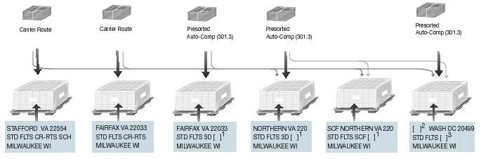 Two bands, one around the length and one around the width. Use sufficient tension. Wire and metal strapping are prohibited. Copalletized Bundles![]() Copalletization allows mailers to place together on pallets bundles from separate mailings that have been independently presorted in accordance with applicable standards (e.g., ECR, automation, and Presorted price mailings). Each separate mailing must separately meet the minimum volume and other requirements as set forth in 705.11.0 unless bundles are prepared under 705.11.0 (Preparation of Cobundled Price and Presorted Price Flats) mailers must bundle their mail separately according to the applicable requirements in 345.5.9 for Presort, 345.6.8 for Enhanced Carrier Route, or 345.7.0 for Automation. Copalletization requires Business Mailer Support authorization (705.8.7). Pallet Presort and Labeling (705.8.10)![]() At the mailer’s option, bundles of flats may be palletized using the advanced presort options in 705.10.0, 705.12.0, or 705.13.0. These presort options require PAVE-certified software. Copalletized mailings: Bundles of Presorted price and automation price flats must be placed on separate