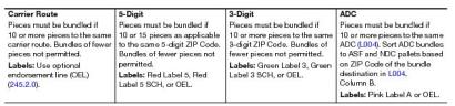 5-Digit Scheme Carrier Routes 4 Required at 500 pounds. Optional at 250 pounds. Labels: For Line 1, use L001, Column B. For Line 2, use “STD FLTS CR-RTS SCH.” | 5-Digit Carrier Routes 4 Required at 500 pounds. Optional at 250 pounds. Labels: For Line 1, use city, state and 5-digit ZIP Code on mail. For Line 2, use “STD FLTS CR–RTS.” | 5-Digit 4 Required at 500 pounds. Optional at 250 pounds. Labels: For Line 1, use city, state and 5-digit ZIP Code on mail. For Line 2, use “STD FLTS 5D” followed by “BARCODED” (or “BC”) for automation price mail and/or “NONBARCODED” (or “NBC”) for Presorted price mail. | 3-Digit 4 Optional at 250 pounds. Labels: For Line 1, use L002, Column A. For Line 2, use “STD FLTS 3D” followed by “BARCODED” (or “BC”) for automation price mail and/or “NONBARCODED” (or “NBC”) for Presorted price mail and/or carrier route mail. | SCF 4 Required at 500 pounds. Optional at 250 pounds. Labels: For Line 1, use L002, Column C. For Line 2, use “STD FLTS SCF” followed by “BARCODED” (or “BC”) for automation price mail and/or “NONBARCODED” (or “NBC”) for Presorted price mail and/or carrier route mail. | ASF 4 and NDC 5 Separate ASF and NDC pallets required at 500 pounds. Optional at 250 pounds. Labels: For Line 1, ASF use L602. For Line 1 NDC use L601. For Line 2, use “STD FLTS” and “ASF” or “NDC” followed by “BARCODED” (or “BC”) for automation price mail and/or “NONBARCODED” (or “NBC”) for Presorted price mail and/or carrier. |